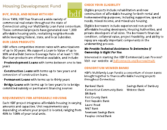 BUY, BUILD, AND REHAB WITH HDF Since 1989, HDF has financed a wide variety of commercial real estate throughout the state of Connecticut using our Multifamily Loan Fund consortium. These commercial projects have generated over 1,300 affordable housing units, revitalizing neighborhoods while leveraging federal, state, and local subsidies. OUR LOAN PRODUCTS HDF offers competitive interest rates with amortizations of up to 30 years. We support a Loan to Value of up to 90% and a Debt Service Coverage Ratio of at least 1.10X. Our loan products are offered as available, and include: · Predevelopment Loans with terms between one to two years · Construction Loans with terms up to two years and conversion of construction loans. · Permanent Loans with terms up to thirty years · Bridge Loans with terms up to two years to to bridge committed subsidy or permanent financing sources REQUIREMENTS FOR AFFORDABLE HOUSING Each HDF project integrates affordable housing in varying amounts and capacities. Unit requirements vary depending on where your project is located, ranging from 40% to 100% of your total units.