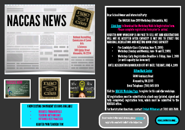 Dear School Owner and Interested Party: The NACCAS June 2019 Workshop (Alexandria, VA) Click Here to Download the Workshop Walk-In Registration Form. Please complete registration form prior to arrival. REGISTER NOW! WORKSHOP IS ON PACE TO SELL OUT AND REGISTRATIONS WILL NOT BE ACCEPTED AFTER CAPACITY IS MET DUE TO STRICT FIRE MARSHALL REQULATIONS AND MEETING ROOM SPACE CAPACITY Pre-Candidate Class (Saturday, June 15, 2019) Workshop (Sunday and Monday, June 16 and 17, 2019) Workshop Early Registration Deadline is Friday, June 7, 2019 (or until capacity has been met) HOTEL RESERVATION ROOM BLOCK CUT OFF DATE: TUESDAY, JUNE 4, 2019 Hilton Mark Center 5000 Seminary Road Alexandria, VA 22311 Hotel Telephone: (703) 845-1010 Visit the NACCAS Workshop Page to register for this and other workshops. All registrations must be submitted via a hard copy (printed, signed and fully completed) registration form, which must be submitted to the NACCAS office. For Registration Questions, contact Erykah Wilkerson at (703) 600-7600. __________________________________ NACCAS Workshop Requirements (effective 1/1/2019): New schools (pre-candidate schools) are required to attend a Pre-Candidate Class on Saturday, as well as, the NACCAS workshop, which will be held on Sunday and Monday, within the 6 month period prior to submitting an Application for Candidate Status. Candidate schools are required to attend a NACCAS workshop, which will be held on Sunday and Monday, once during the first 12 months of candidacy and again, if necessary, during the second 12 months of candidacy. Note: Candidate schools who have not yet attended a NACCAS workshop, must attend the Pre-Candidate Class on Saturday, prior to the NACCAS workshop, which will be held on Sunday and Monday. This is a one-time requirement. Newly Accredited schools are required to attend a NACCAS workshop, which will be held on Sunday and Monday, at least once during each of the institution's first 3 years of accreditation. Accredited schools are required to attend a NACCAS workshop between 9 and 24 months of their next anniversary date. NACCAS Evaluators are required to attend a NACCAS workshop, which will be held on Sunday and Monday, within 24 months of attending a prior workshop.