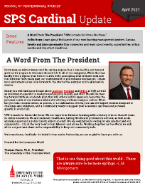 Every year, as winter wanes and the spring approaches, I can feel the excitement grow as we prepare to welcome the new life to all of our campuses. While this has hardly been a typical year before or after 2020, and spring 2021 will also look and feel different from years past, our commitment to you remains unchanged. I share your excitement as we look forward to the start of the summer and to graduation season. Below you will find more details about learning, working and living at UIW, as well as information specific to students and parents, faculty, and staff. We will be mov- ing forward with an academic plan that will offer a hybrid approach, honoring the personal needs of our students while still offering a vibrant campus culture. Whet- her you take courses online, in-person, or a combination of both, you can still expect classes designed to challenge and enlighten, and a community ready to support your academic, spiritual and personal growth at every turn. UIW is made for times like these. We are experts in distance learning with a history of more than 20 years in online education. We are leaders in healthcare, having five health professions schools, as well as an epidemiologist and a public health expert on staff. We are committed to caring for one another and our community – it is at the very heart of our Mission and all we do. Working together as One Word, we will all do our part and share in the responsibility to keep our community safe. Welcome home, Cardinals. On behalf of our entire University, we are so glad to have you with us. Praised be the Incarnate Word!