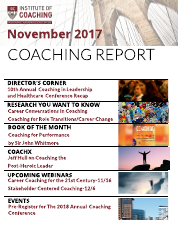 In October, the IOC had several opportunities to highlight and support coaching research. During the Annual Conference on October 13th and 14th, we organized research sessions at which many scholars presented their most recent work on a variety of research topics in health coaching, workplace and leadership coaching and career coaching. These sessions included outstanding talks and posters from prominent scholars who have been members of the Scientific Advisory Council, as well as current and past Harnisch grant recipients: Gary Sforzo, Ruth Wolever, Tatiana Bachkirova, Reinhard Stelter and Gordon Spence. The 2017 poster awards were presented to Carolin Graßmann (for Best Poster), France Asselin, and Elizabeth Ahmann with co-authors Micah Saviet, Lisa Joy Tuttle(Honorable Mention Awards). One of the research sessions was by Janice Sabatine and Steven Wendell, who are current Harnisch Scholars and are also hosting our November Webinar, Career Coaching for the 21st Century. Their conference presentation, Strategies and Two-year Results for a Vision-based Coaching Supplement to a Graduate Student Career Course, was based on Janice and Steven’s on-going study and addressed issues in research and practice of career coaching. I’ve highlighted several other publications relevant to career coaching. The first is an article recently published in Coaching: An International Journal of Theory, Research and Practice; and the second is a chapter from the valuable resource, The Sage Handbook of Coaching.