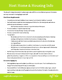 Thank you for being interested in hosting Eagle Lake staff this summer! Below is general information and requirements for hosting Eagle Lake staff. Host Home Requirements Our preference is at least 3 staff per home, however the minimum is 2 staff per household. Each staff member needs their own sleeping area off of the floor. (No sharing beds, and beds are preferred over air mattresses or couches). Staff members may share rooms as long as the beds are 6 feet apart. Provide breakfast all 7 days (Sunday-Saturday) Provide dinner Sunday, Monday, Tuesday, and Thursday Provide a sack lunch for travel on Saturday. Transportation: We ask that each Host Home to meet at the church and pick up staff at 8 pm on Saturday evening, and bring them to the first church service on Sunday morning. If able, we also ask Host Homes to provide transportation to the church on the Saturday morning staff leave. ELC will provide transportation to and from Host Homes in our vans the rest of the week. Staff will return to Host Homes between 5:30 and 6 pm on all evenings except for Wednesday and Friday, when they should be home no later than 9 pm. Staff will stay at Host Homes Saturday night before camp through Saturday morning after camp. We have seen an increase in dietary needs for Eagle Lake staff. The most common diets are gluten-free, dairy-free, or vegetarian. While not a requirement, if you are willing to accommodate any of these needs, please indicate it on your sign up form. Process for Signing Up Visit eaglelakecamps.com/hostfamily and find your church’s name. The link will lead you to a Google Form where they will fill out your information. If you would like to host staff, please sign up at least one month before camp. Eagle Lake will begin sending emails about staff assignments and other hosting information 3 weeks before the start of camp.