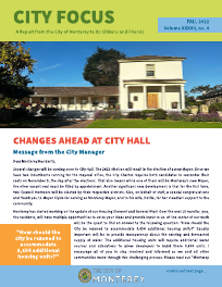Dear Monterey Residents, Several changes will be coming soon to City Hall. The 2022 election will result in the election of a new Mayor. Since we have two incumbents running for the mayoral office, the City Charter requires both candidates to surrender their seats on November 9, the day after the elections. That also means while one of them will be Monterey’s new Mayor, the other vacant seat must be filled by appointment. Another significant new development is that for the first time, two Council members will be elected by their respective districts. Also, on behalf of staff, a special congratulations and thank you to Mayor Clyde for serving as Monterey Mayor, and to his wife, Dottie, for her steadfast support to the community. Monterey has started working on the update of our Housing Element and General Plan! Over the next 13 months, you, the residents, will have multiple opportunities to voice your ideas and provide input to us. At the center of our work will be the quest to find an answer to the following question: “How should the City be rezoned to accommodate 3,654 additional housing units?” Equally important will be to provide transparency about the existing and forecasted supply of water. The additional housing units will require additional water sources and allocations to allow developers to build those 3,654 units. I encourage all of you to stay involved and informed as we and all other communities move through this challenging process. Please read our "Monterey 2031" article on page 6 explaining this undertaking in more detail. As always, the City Focus contains many interesting articles, which highlight certain aspects of our work and our initiatives. Monterey is truly a special place to live and work. Thank you for your help and support. Enjoy the upcoming holiday season. We have some new dining establishments that complement the longtime, popular restaurants, as well as many fun and interesting shops to explore. We always encourage to buy local! May the new year bring an ease to the economy and peaceful resolutions to the current conflicts happening around the world. ANDA! City Manager, Hans Uslar