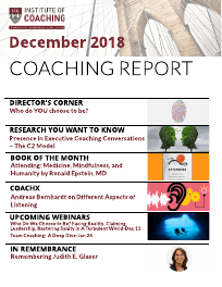 As we approach the close of another tumultuous year — with devastating fires, floods, school shootings, political drama, re-emergent cold wars, economic gyrations — it feels fitting to step back for a moment, breathe, and perhaps reflect on a question for our times: who do you choose to be as a coach, as a human being, in these volatile times? I’m hoping that best-selling author, Margaret Wheatley, won’t mind me borrowing this question from her powerful book: Who Do We Choose to Be? Facing Reality, Claiming Leadership, Restoring Sanity in A Turbulent World. Wheatley calls for leaders to be steadfast, trustworthy and present in these challenging times. And so too, as coaches, we need to continuously build our capacity to be fully awake — centered, compassionate, and courageous — in our work. We may not be in positions of direct leadership, but the science is clear: coaching has impact. In fact, as IOC Harnisch grant awardee Sean O’Connor’s research indicates, there is a ‘coaching ripple effect’ whereby coaching has influence, not just on the client but on the whole system in which it is embedded. Recently, I collaborated with Senior Instructor, and Lead Executive Coach at ESMT, Andreas Bernhardt (see this month's featured CoachX), on a workshop to help coaches elevate their impact in high stakes situations in the C-suite. Reflecting on how we show up as coaches, Andreas and I identified three ‘P’s of coaching agility: Presence, Perspective, and Persona. We asked the attendees to reflect on the following: Presence: What is your physical, emotional, and mental state as you enter the coaching space? Are you self-reflective, grounded, centered, and ready to listen? Do you trust the process? Trust the client? Trust yourself? Are you focused on having the answer or planning moves? How do you integrate mindfulness practices into your work? Perspective: Are you aware of your own biases or personal agendas as you coach? Are you aware of how your training as a coach, consultant, psychologist, or business person may influence your listening? Are you continuously looking to expand your horizons for listening — with curiosity? Open-mindedness? Persona: Are you aware of the multiple roles you play when coaching? Are you an advisor? Healer? Teacher? Parent? Expert witness? As Tatiana Bachirova demonstrates in her research, we all have multiple mini-selves that emerge in the coaching dynamic. We (and our clients) are much more than a singular self. The key to success: become aware of the multiple roles you play — and more conscious in choosing who to be, and when. I hope the questions above inspire you to reflect on your practice as this year winds down. For a deeper evidence-based dive into the topic of presence, our Research You Need to Know this month includes Roger Noon’s dynamic, relational C2 Model, from his work on Presence in Executive Coaching Conversations. Our book selection this month, Attending: Medicine, Mindfulness and Humanity, by Ronald Epstein, M.D. borrows from another helping profession — where the choice of how to be can have life and death consequences. Dr. Epstein’s reflections on how physicians’ attend to their patients is beautifully analogous to how we aspire to be present with our coaching clients. Finally, please join us to hear from one of the most important voices on leadership and coaching of our time: Margaret Wheatley. Meg will present a webinar for the IOC on December 11th, and she will surely remind us that in times like these, "we are all called to step forward, hold our ground, and support the human spirit." Season’s Greetings, Jeff