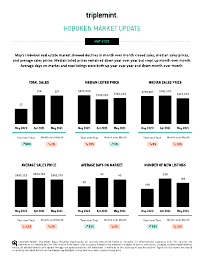 May's Hoboken real estate market showed declines in month over month closed sales, median sales prices, and average sales prices. Median listed prices remained down year over year but crept up month over month. Average days on market and new listings were both up year over year and down month over month.