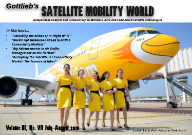 Welcome to the July-August 2018 issue of Gottlieb's Satellite Mobility World. Our July-August Issues features airline connectivity. In "Unlocking the Riches of In-Flight Wi-Fi," we'll hear from Patee Sarasin, the highly innovative former CEO of Nok Air on how to make money - and a lot of it - with in-flight Wi-Fi. We continue our focus on in-flight connectivity in an interview featuring former Panasonic Avionics Vice President, Dave Bruner. In it, he explores the market , its evolution and the challenges facing in-flight connectivity providers as they struggle toward profitability. Finally, we hear from the Ernst Hovinga, CEO of Hiber, an emerging satellite IoT provider with an incredibly disruptive technology designed to provide low cost global satellite IT connectivity using the HF frequency band and a constellation of nanosatellites. Enjoy! Gottlieb's Satellite and Mobility World is published monthly (except August) by Gottlieb International Group., Inc. Suite 100, 1209 South Frederick Street, Arlington, VA USA 22204 © Copyright 2018 (Tel +1-703-622-8520) Interested in our unique Promotional Capabilities? Contact us today! Gottlieb's Satellite and Mobility World is published monthly (except August) by Gottlieb International Group., Inc. Suite 100, 1209 South Frederick Street, Arlington, VA USA 22204 © Copyright 2018 (Tel +1-703-622-8520) Interested in our unique Promotional Capabilities? Contact us today!