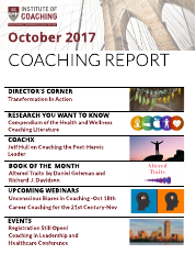 Transformation in action. That’s the phrase that always comes to mind during autumn – my favorite time of year. The leaves, with their explosion of color, vibrantly remind us of the cyclical nature of life. And this month the IOC gears up for our annual conference, one of the world’s largest gatherings of practitioners in the transformative profession of coaching. This year is particularly special as we celebrate our 10th anniversary, bringing together a smorgasbord of luminaries: Dan Goleman, Margaret Wheatley, Marshall Goldsmith, Susan Cain, Whitney Johnson, James Prochaska and Ryan Niemec, just to name a few! Even more important, our annual conference shines a light on what we are most passionate about at the IOC: evidence-based research that supports the transformational work of our global community of coaches. Here are just a few examples of the research that will be presented at the conference: Grant Recipient: Gordon Spence, PhD—Coaching for employee engagement using self-determination theory. Grant Recipient: Les Schwab, PhD—Coaching to improve well-being and reduce burnout in physicians. Grant Recipients: Steven Wendell, PhD and Janice Sabatine—Coaching for sustained career development among graduate students. The work of these scholars – and many more – point to the power of coaching to transform and enrich lives. This month’s recommended book, from one of the IOC’s dear friends, Dan Goleman, also follows this theme of transformation. Altered Traits explores the history, evolution and scientific underpinnings of the power of meditation as a practice that can ineluctably change us: mind, heart and being. And, in this month’s webinar, Carlos Davidovich presents a neuroscience-based deep-dive into unconscious bias, reminding us that transformation always begins at home – as a quest for self-awareness.