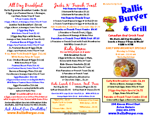 All Day Breakfast Rallis Signature Breakfast Combo $9.95 3 Eggs, 2 pcs Peameal Bacon, 2 Sausages, 1 pc Ham, Home Fries & Toast 3 Peat Combo $9.75 3 Eggs, 3 Bacon, 3 Sausages, Home Fries & Toast Lumber Jack Breakfast! $10.95 4 Eggs, 4 Bacon, 4 Sausages, Home Fries & Toast 3 Eggs Any Style With Home Fries & Toast $5.95 3 Eggs Any Style with Bacon, Sausage or Ham, Home Fries & Toast $6.95 Peameal Bacon & Eggs $9.95 3 Eggs, 3 pcs Peameal, Home Fries & Toast Jr. Peameal Bacon & Eggs $8.95 3 Eggs, 2 pcs Peameal, Home Fries & Toast 6 oz. New York Steak & Eggs $12.95 With Home Fries & Toast 6 oz. Chicken Breast & Eggs $12.95 With Home Fries & Toast Peameal Bacon Plate $10.95 5 pcs Peameal Bacon, Home Fries & Toast Bacon or Sausage Plate $10.95 8 pcs Bacon or Sausage, Home Fries & Toast Eggs Benedict $10.95 3 Eggs poached served on an English Muffin With Ham or Peameal Bacon & Home Fries Eggs Florentine $10.94 3 Eggs poached on an English Muffin with Spinach & Home Fries New! Greek Breakfast $10.95 4 Eggs, 4 pcs Bacon on a Grilled Pita Drizzled with Oregano & Feta. Served with Home Fries