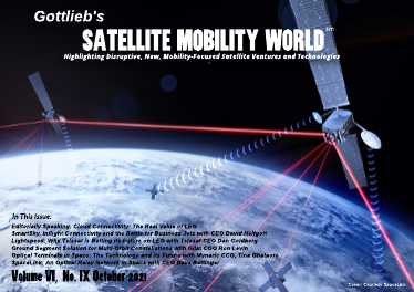 Welcome to the October Issue of Satellite Mobility World. We're focusing on a variety of hot topics this month. As SmartSky's rivalry with Gogo intensifies, we're following up last month's interview of Gogo's CEO, Oakleigh Thorne, with SmartSky's CEO, David Helfgott. Next, we interview with Dan Goldberg, Telesat's well-known CEO. Goldberg defends his belief in the LEO constellation's supremacy and his conviction that Telesat's LEO, Lightspeed, will offer economics and performance far superior to any GEO or LEO alternative. Following Dan, we examine two critical components of LEO constellations, the ground infrastructure, and the inter-satellite optical links. First, Ron Levin, Gilat's new COO, overviews the new hybrid satellite networks their impact on ground segment infrastructure. Next, we look at optical technology, which has become a critical element of these new networks. First, Tina Ghataroe, Chief Commerical Officer at industry leader Mynaric takes us on a tour of their optical inter-line solutions. Following Tina, we hear from SpaceLink's David Bettinger and how his unique optical relay network in Space leverages the unique technology. Lastly, our editorial unveils what we believe to be the real value play in the LEOs. Enjoy! Satellite Mobility World Published by Gottlieb Gottlieb International Group www.gottliebinternationalgroup.com Washington, DC USA © 2021 Satellite Mobility World Published by Gottlieb International Group, Inc. www.gottliebinternationalgroup.com © 2020 For Information on advertising opportunities +1-703-622-8520 Satellite Mobility World Published by Gottlieb International Group Arlington, Virginia, USA www.gottliebinternationalgroup.com Satellite Mobility World is published by Gottlieb International Group, Inc. 1209 South Frederick Street, Arlington, VA 22204 USA 703-622-8520 www.gottliebInternationalgroup.com © Copyright 2020 . 1209 South Frederick Street, Arlington VA USA 22204 www.gottliebinternationalgroup.com +1-703-622-8520 Published by Gottlieb International Group, Inc. Arlington, VA USA Tel: 703-622-8520 Gottlieb's Satellite and Mobility World is published monthly (except August) by Gottlieb International Group., Inc. Suite 100, 1209 South Frederick Street, Arlington, VA USA 22204 © Copyright 2019 (Tel +1-703-622-8520)