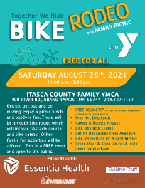 FREE HELMETS**For the first 100 kids Compliments of Grand Itasca Clinic & Hospital Free Hot Dog lunch Games & Bounce Houses Bike Obstacle Course Get Fit Itasca Bike Fleet Available Bike inspections by Ardent Bicyles Green Door & Kona Ice Food Truck items for purchase
