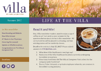Hey, Villa newsletter readers, want to enjoy a cup of coffee on us? Just send us your answers to the questions below about stories in this newsletter. All correct entries will be placed in a drawing, and two winning names will be randomly chosen. Deadline for entries is July 15, 2017. Please submit answers to VHC@villahc.com. What does Villa Healthcare’s new logo say? Name one of the Villa Healthcare locations currently undergoing incredible renovations. How many food items did The Villa at Evergreen Park collect for the company-wide food drive? True or False: Intranets, or private employee networks, are common in the skilled nursing industry.