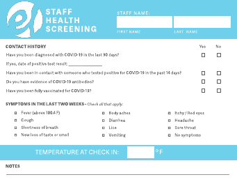 Fever (above 100.4 F) Cough Shortness of breath New loss of taste or smell Body aches Diarrhea Lice Vomiting Itchy / Red eyes Headache Sore throat No symptoms