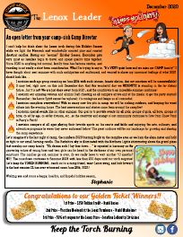 I can’t help but think about the Lenox torch during this Holiday Season while we light the Menorah and wonderfully scented pine and roasted chestnut candles. During our “normal” Holiday Season, December gets very quiet as families begin to travel and spend quality time together. Since 2020 is anything but normal, family time has become routine, and traveling is not really a short term consideration. What I’m trying to say is, “It’s VERY quiet here and we miss our CAMP family!” I have thought about next summer with such anticipation and excitement, and wanted to share my innermost feelings of what 2021 should look like… I envision each age group reuniting on June 26th with such intense, fanatic elation, that my emotions will be uncontrollable! It may feel, right now, on this cold December day, that this wonderful day we REIGNITE is standing in the far distant future...but it’s not! We are just days away from 2021, and the countdown to an incredible summer continues! I envision our amazing veteran and alumni Staff cheering as all campers arrive and at the meals, to get the party started! Remember, the Lenox Spirit cannot be replaced; it’s contagious and keeps us all connected. I envision campfires everywhere! With so many new fire pits in camp, we will be cooking outdoors, and keeping the wood ablaze into the evening hours. The best conversations and stories come from around the campfire! I envision special events like no other summer. Our goal is to provide events for all girls, groups of girls, all boys, groups of boys, co-ed by age, co-ed by division, etc...so the creativity and energy of our community continues to flow from Shaw Pond to Pasty’s Patch! I envision campers of all ages playing their favorite sports on the courts and fields and enjoying the arts, culinary, and adventure programs in ways they never embraced before! The great outdoors will be our landscape for growing and sharing the camp experience. Let’s imagine it’s the last night of camp; the numbers 2020 burning bright in the campfire area as we hum the alma mater and hold on tight to our small burning candle. The Berkshire sky is illuminated with the Northern Lights shimmering above the grand pines that envelop our camp family. “Oh chosen rock I lay thee down…” is repeated in harmony as the quavering voices of young boys and teen girls can be heard in the darkness of our own personal sanctuary. The candles go out, summer is over, do we really have to wait another 10 months? NO!! The countdown continues to Summer 2021 with less than 200 days until our torch reignites! Let’s keep the TORCH BURNING...reach out to a camp friend, wear Lenox swag, and look forward to the best reunion CL has ever witnessed come June 26th, 2021! Wishing you and yours a happy, healthy, and hopeful holiday season, Stephanie