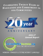 Fiscal year 2016-17 started Salinas Valley Recycles (SVR) in a stronger financial position than we have seen in recent years. Increases in materials, both recycled and landfilled, has resulted in year-end revenues beyond our budgetary projections for the third straight year. Increased revenues have allowed SVR to fund all of our reserves to levels above prior years and set aside funds for major capital projects coming in the future such as the next waste disposal module at Johnson Canyon Landfill and potential proposed Salinas Area Facility improvements. Self-funding our operations with only local revenues and no waste importation to our landfill has turned out to be one of the most significant and forward-thinking decisions for our Board. We now operate within our means and no longer rely on a limited and declining revenue source from selling our landfill space. This decision has required rate adjustments over the years to address the true cost of service. However, the public can be assured through the Board’s leadership, that we are fully utilizing our community revenues to operate our public utility services in a cost-effective manner, improving services and environmental stewardship, while limiting our long-term landfill liabilities. Staff and I want to thank the Board of Directors for their leadership in moving forward the final decision to complete SVR’s long-range planning for our future public facility needs. As SVR’s member agencies embark on implementing their local plans to create more vibrant, healthy and sustainable communities, the contributions of SVR to these goals are critical and significant. Garbage and recycling like water, sewer, gas and electricity are essential public utility services that are important to community health and well-being. Yet, the importance of our services are often overlooked. Ask the 90,000+ visitors per year to our Sun Street Recycling and Transfer Station and they will agree that this facility is an important part of our community’s utility infrastructure. When we use trash or recycling containers at home or work, we expect the by-products of our lifestyle to just go “Away”. SVR and our partners, marketers, and collectors are the “Away”, and as a community utility service provider, we must work in an ever-increasing atmosphere of expanding environmental regulation, financially and politically complicated markets for recycled materials, climate change adaptation mandates, and local concerns over solid waste facilities and transportation. Community partnerships, technological innovation and climate action plan opportunities continue to drive the sustainable future vision of SVR and our partner agencies. Our vision is for a future which uses waste as a resource, instead of burying it and creating unnecessary long-term environmental obligations for the community’s future. These changes are often hard to achieve within the complexity of new laws and regulations, existing financial obligations, and community concerns. However, as communities, each of us has made this commitment to change through our General Plans, Strategic Plans, Climate Action Plans and Economic Development goals that guide the whole region towards more sustainable living and the creation of new job opportunities. Salinas Valley Recycles is part of this healthy change. Our Future This annual report is a summary of the Authority’s accomplishments, waste reductions activities, cost saving measures, and its dedicated professional staff for the 2016-2017 fiscal year. We hope it provides the reader with a clear overview of the sustainable direction of Salinas Valley Recycles! I want to again thank the Salinas Valley Recycles Board of Directors, staff, community partners, our Citizens Advisory Group, and all those who have supported our efforts to improve our environment and help make sustainable living in the Salinas Valley a reality. R. Patrick Mathews General Manager/Chief Administrative Officer