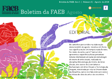 Os caminhos percorridos na elaboração desse boletim de agosto resultou em flores. Isso significa muito em tempos nada floridos. No relato docente, a prof.ª Janice Lima apresenta a experiência Rosas pensativas: leituras intertextuais em aulas de metodologia do ensino de artes visuais, realizada na disciplina Metodologia do Ensino de Artes Visuais, dos cursos de Licenciatura e Bacharelado em Artes Visuais e Tecnologia da Imagem, ministrada por ela na Universidade da Amazônia. Janice nos fala sobre processos de leitura de obra de arte e de encontros intertextuais promovidos entre a pintura de Salvador Dali, Rose Meditative e os poemas Ode a Salvador Dali, do poeta andaluz Garcia Lorca e Rosa de Hiroshima, do poeta brasileiro Vinícius de Moraes. No ensaio visual, a artista-professora Ana Ruas, de Campo Grande-MS, nos invade com folhagens, flores e pendões em verdes e azuis profundos e ação educativa. Ana trabalha aos sábados com crianças em seu ateliê, fugindo de estereótipos e provocando a percepção e a imaginação. Um olhar poético sobre o mundo. Em Diálogos Internacionais, nossa entrevistada é com Marie-Françoise Chavanne, ex-professora de artes da Universidade de Versaille, na França, e ex-presidente da InSEA - International Society for Education Through Art (Associação Internacional da Educação por meio da Arte), de 1985 a 1988. Na entrevista, a professora fala do seu contexto docente, dos desafios que enfrentou enquanto presidente do InSEA, das políticas públicas atuais, de arte e cultura enquanto compromisso histórico e outras questões presentes em sua trajetória profissional. No espaço dedicado ao ConFAEB/2018, falamos das mesas previstas para o evento, como, por exemplo, a que reunirá representantes das associações de artes nas suas diferentes linguagens: ABRACE – Associação Brasileira de Artes Cênicas; ABEM – Associação Brasileira de Educação Musical; ANPAP – Associação Nacional de Pesquisadores em Artes Plásticas e ANDA – Associação Nacional de Pesquisadores em Dança. A questão colocada para esses representantes será: como cada associação tem enfrentado as atuais políticas educacionais que excluem o ensino de arte na escola? Como de costume, o Mural da FAEB traz informações sobre eventos relacionados ao campo da arte, educação e cultura, procurando mostrar articulações e dinâmicas da nossa área em todo o país. Assim, recebamos esse agosto com flores, rosas, verdes, azuis, com a arte nas escolas e nas ruas, pois existir ainda é a melhor forma de resistir. Leda Guimarães
