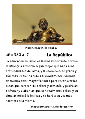 La educación musical, es la más importante porque el ritmo y la armonía llegan mejor que nada a las profundidades del alma, y la envuelven de gracia y aún más, el que ha sido adecuadamente educado en música tiene mayor facilidad para reconocer las cosas que carecen de belleza y armonía, y podrá así disfrutar y alabar las que son realmente bellas, y su alma asimilará la belleza y se hará a su vez más hermosa ella misma.
