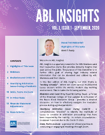 Welcome to ABL Insights! ABL Insights is a quarterly newsletter for ABL Members and their respective clients that provides industry insights that span across the globe. The purpose of this newsletter is to further ABL's goal of sharing legal industry related information that can be absorbed and utilized by ABL Members and their clients. In this first edition of ABL Insights, our mini theme is "working virtually" - where we cover various multifaceted issues existent within the world's modern day working environment. This includes the following articles: Mediation and Covid-19 by Read McCaffrey. Read - a Fellow of the American College of Trial Lawyers & co-founder of the Rasco Klock Mediation Group - provides a detailed discussion on how to effectively navigate the mediation process during a global pandemic. Identifying Arbitration Issues During Covid-19 - a comprehensive "checklist" to identify the multitude of issues to consider in arbitration proceedings that have been impacted by the inability - in certain circumstances - to appear in-person due to the Covid-19 crisis. Smile, You're on Zoom - a general list of best practices in conducting or engaging in meetings through Zoom.