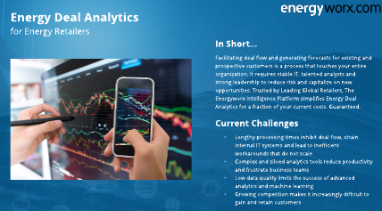 In Short... Facilitating deal flow and generating forecasts for existing and prospective customers is a process that touches your entire organization. It requires stable IT, talented analysts and strong leadership to reduce risk and capitalize on new opportunities. Trusted by Leading Global Retailers, The Energyworx Intelligence Platform simplifies Energy Deal Analytics for a fraction of your current costs. Guaranteed.