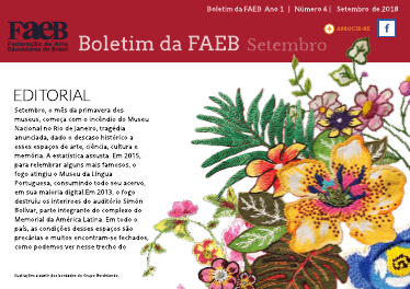 Setembro, o mês da primavera dos museus, começa com o incêndio do Museu Nacional no Rio de Janeiro, tragédia anunciada, dado o descaso histórico a esses espaços de arte, ciência, cultura e memória. A estatística assusta. Em 2015, para relembrar alguns mais famosos, o fogo atingiu o Museu da Língua Portuguesa, consumindo todo seu acervo, em sua maioria digital.Em 2013, o fogo destruiu os interiroes do auditório Simón Bolívar, parte integrante do complexo do Memorial da América Latina. Em todo o país, as condições desses espaços são precárias e muitos encontram-se fechados, como podemos ver nesse trecho do manifesto de ativistas de movimentos culturais do Amapá: Temos sim que chorar pelo Museu Nacional...Nosso maior acervo Arqueológico Maraca e Cunani estavam nesse Museu. Temos em nosso Estado do Amapá, mais de 70 Sítios Arqueológicos cadastrados pelo IPHAN, Antes que todos desapareçam, estamos nos mobilizando para agir por eles...E não esquecemos que no Amapá o Museu Joaquim Caetano está fechado... Também o Museu Kuahi no município de Oiapoque também encontrasse fechado. Ou agimos, ou vamos lamentar em breve! (contribuição de Rildo, nosso representante FAEB no Estado do Amapá). A luta por esses espaços é urgente e passa tanto por processos de atenção de políticas públicas quanto políticas educacionais. Nesse sentido, o boletim de setembro traz exemplos de projetos educativos que passam por educação patrimonial, memória, comunidade e pela criação de museus de território. Essa proposta de musealização do território visa despertar nos indivíduos um conhecimento crítico e uma ação transformadora da sociedade. É essa a experiência que a professora Elenilce Mourão nos apresenta: a formação de recursos humanos em educação para o patrimônio, mediação, expografia, conservação, dentre outros, vinculados ao Projeto Matriz Ecomuseu Delta do Parnaíba, concebido como uma Rede de Museus de Território, equipamentos culturais descentralizados e autônomos, orientados por boas práticas de Ecomuseus, a considerar o território, as pessoas e o patrimônio cultural. O ensaio visual, que também compõe o projeto gráfico desta edição, vem de uma experiência de mulheres, professoras aposentadas no Distrito Federal, que se reúnem sistematicamente, há 18 anos, para bordar e compartilhar vidas, afetos, histórias e memórias, realizando performances em locais públicos e exposições. Neste grupo, temos Celinha, nosso anjo da FAEB, que foi a interlocutora para que o trabalho fosse apresentado nesse boletim. Para o espaço Diálogos Internacionais, temos como entrevistada a Dra. Olaia Fontal Merillas, professora Titular na área de Didática de Expressão Plástica na Universidade de Valladolid/ Espanha. Olaia tem uma linha de pesquisa em Educação Patrimonial e gerencia o Observatório de Educação Patrimonial na Espanha. Para a pesquisadora, conhecer programas que estão sendo feitos em educação patrimonial nos permite tomar o pulso da educação patrimonial em um país, mas também nos fornece um "banco de boas práticas" que, por sua vez, expande o leque de possibilidades sobre o que pode ser realizado na educação patrimonial. Na seção Confaeb 2018, para fazer um link com a vibe desse boletim, divulgamos detalhes da mesa História e Memória. Temos, ainda, uma nota sobre a reunião da FAEB no CNE, que aconteceu no dia 13 de setembro de 2018 e um resumo II Seminário de Arte Educação e Intercultura da Região Norte, que aconteceu no Amazonas, onde importantes questões foram elaboradas para serem discutidas neste Confaeb. Por fim, nosso mural, onde procuramos divulgar ações diversas relacionadas à arte e seu ensino, por todo o território nacional. Leda Guimarães