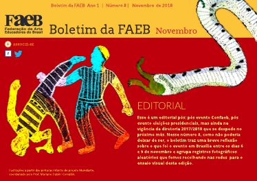 Esse é um editorial pós: pós evento Confaeb, pós evento eleições presidenciais, mas ainda na vigência da diretoria 2017/2018 que se despede no próximo mês. Nesse número 8, como não poderia deixar de ser, o boletim traz uma breve reflexão sobre o que foi o evento em Brasília entre os dias 6 e 9 de novembro e agrupa registros fotográficos aleatórios que fomos recolhendo nas redes para o ensaio visual desta edição. Na seção Diálogos internacionais, Sidiney Peterson nos apresenta sua conversa com as professoras Cynthia Blaconá e Jimena Rodríguez, da Escuela Provincial de Artes Visuales, em Rosario, Argentina.Esse encontro resultou em registros/memórias/modos de (re)existência a partir da experiência “Passiflora caerulia: vibraciones infinitas”. Temos um relato de experiência diferente dos boletins anteriores, uma vez que neste, o professor Mariano Dubini Corvalán nos apresenta o Mundiarte - um espaço organizado a partir das exposições das Bienais Internacionais de Arte Infantil e Juvenil que reúnem um fantástico acervo de desenhos infantis de crianças de mais de 30 países mundo. Este material permitiu a criação de um arquivo, no ano de 1979, que recebeu o nome de Centro de Investigaciones y Documentación de IMEPA (CIDI). Com a criação do arquivo, foi iniciada a etapa de catalogação, ordenamento, manutenção e arquivamento manual das obras. Na concepção, tanto das exposições quanto da organização do acervo, temos muito forte o ideário da Educação pela Arte que balizou a educação na América Latina. Pena que esses espaços não existam em maior número. No Brasil, temos a coleção de Desenhos Infantis do Acervo Mário de Andrade, estudada pela pesquisadora Rejane Coutinho, que pertence ao Instituto de Estudos Brasileiros da Universidade de São Paulo. Finalmente, nosso mural procura acompanhar a diversidade dos eventos que acontecem em nossa área, nos quais questionamentos de várias ordens são colocados em pauta: feminismos, pós-colonialismos, fazeres da arte contemporânea, dentre muitos outros que indicam que o tempo não para e que os espaços de formação estão vivos. Mesmo que chova pesado, que tenhamos o movimento dos peixes na piracema que desafiam correntezas rio acima! Leda Guimarães