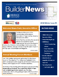 Over 140 members and guests gathered at the Wychmere Resort on Thursday Dec 7 to: review Assn highlights from 2017; look ahead to 2018; install the 2018 board of directors & officers, and recognize the 2017 member awardees. The theme of the evening, which was graciously sponsored by Shepley Wood Products, The Cooperative Bank of Cape Cod, and Mid-Cape Home Centers, was “Building Community”, which is the guiding principle of the Association and its members. continued on page 3 Heading the organization for a two year term as President is Peter Kimball, co-owner of APKimball Construction with his wife Angela Kimball, whose company does it all – new construction, additions, and remodeling. Joining Kimball on the Executive Committee as officers are: 1st Vice President and Treasurer, Trevor Meyer, Meyer and Sons, Inc.; 2nd Vice President and Secretary, Ben LaMora, Lineal, Inc.; Immediate Past President, Matt Anderson, Anderson Framing, Sandwich Also serving on the Board of Directors: Nick Bowes, Bayside Building, Inc.; John Cotton, First Citizens Federal Credit Union; April Ducott, Cape Associates, Inc.; Brian Harding, Andersen Windows; Tim Sawyer, Brown Lindquist Fenuccio & Raber Architects, Inc.; Tony Shepley, Shepley Wood Products, Inc.; Jack Stevenson, Mid Cape Home Centers. The 2017 HBRACC Hall of Fame Award, the highest award a member can receive, was presented to Mike Duffany, owner of M. Duffany Builders. The 2017 Builder of the Year is Peter Kimball, and Associate Members of the Year went to Brian Harding of Andersen Windows, and also to Gail O’Rourke, White Wood Kitchens. Leah Fennell of Shepley Wood, and Dave Ortolani-Paraclete Press were named Volunteer Members of the Year. A new category was introduced this year, Friends of HBRACC, and the inaugural honorees were Wendy Northcross, CEO of the Cape Cod Chamber of Commerce, and Matt Pitta, News Director of Cape Cod Broadcasting Media for their support of HBRACC’s mission. The HBRACC Building Community Award is given to members who consistently through philanthropic efforts builds community, transforms lives, and promotes a positive image of Cape Cod’s building industry. This year’s recipients were EJ Jaxtimer, Jaxtimer Builder Inc, and Ralph Cataldo, Cataldo Custom Builders. Special Appreciation Awards were given to Garry Prevedini-Boston Cedar, Andrea Baerenwald-Cape Associates, Jen Crawford-Jenick Studio, Natascha Batchelor-The Davey Expert Tree Co, Gary Souza-Rogers & Marney, Jim Gronski-Gronski Construction, Anthony Baroni and his team at Stonewood Products, and Matt York-York Construction.